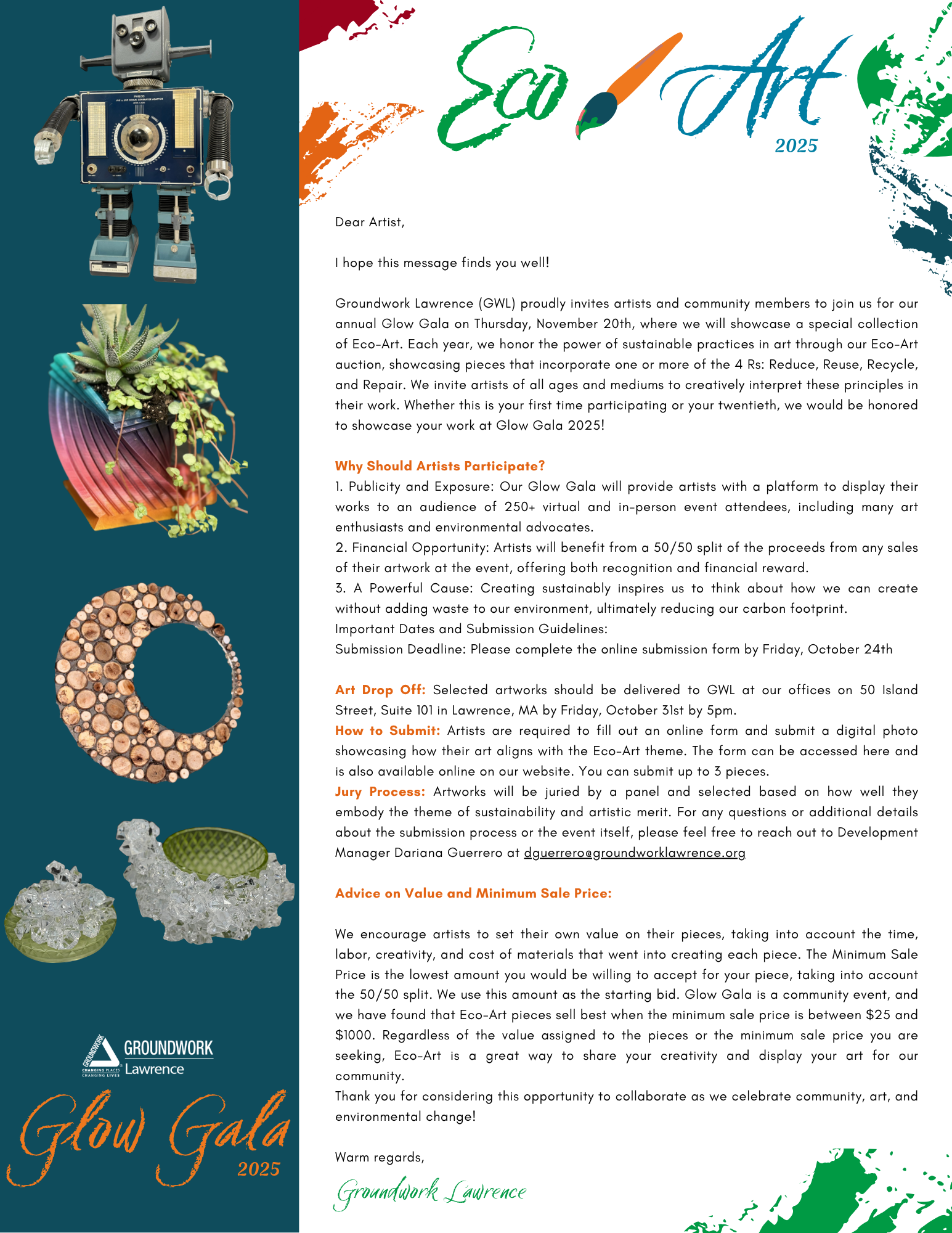 Groundwork Lawrence invites you to celebrate our projects, partnerships, and programs during Glow Gala 2025. The event features the much loved Eco-Art Exhibit, Silent Auction, raffles, food & beverages, and a dynamic speaking program which includes a presentation from our Green Team.
