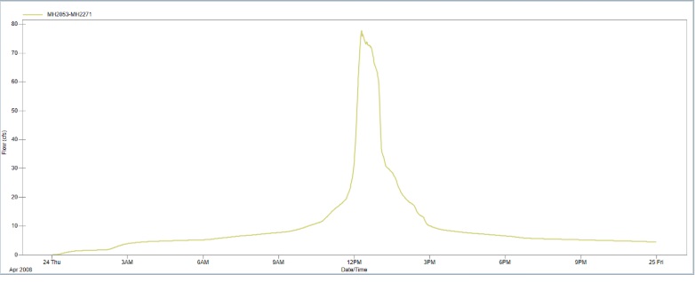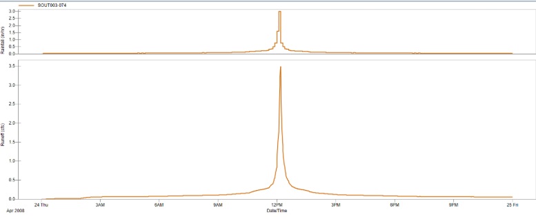 El gráficocolocadoarriba muestra un componente hidrológico del modelo: Cuando llueve, parte del agua empapa en el suelo, y el resto del agua se escurre por las calles. El tl gráfico muestra la precipitaciones que se aplican al modelo, y el El gráfico inferior muestra el escorrentía resultante.