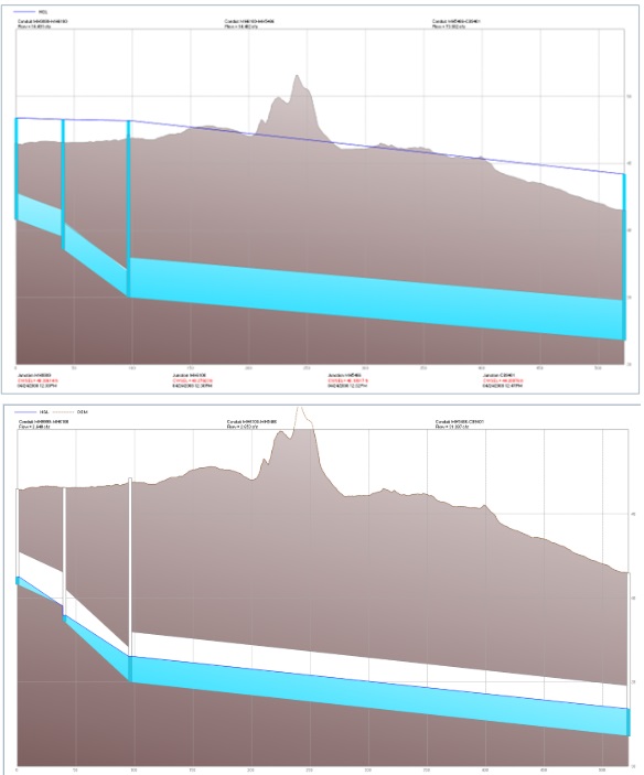 Estas cifras muestran el perfil de una tubería de aguas pluviales para dos precipitaciones diferentescon el nivel del agua en azul. Estos perfiles muestran que las tuberías son lo suficientemente grandes para transportar las aguas pluviales del primer episodio de precipitaciones, pero no las del segundo, que hace que el agua se estanque en las calles. Estos perfiles son una de las herramientas que pueden utilizarse para identificar identificar las zonas problemáticas e investigar soluciones.